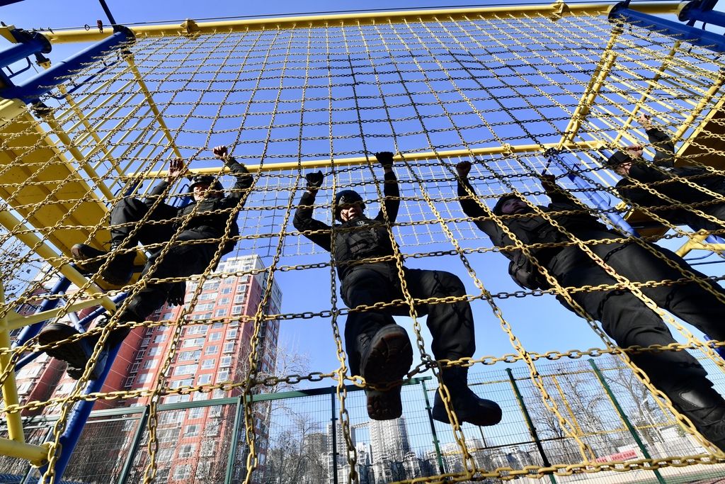 2025年1月3日,北京铁路公安处特警支队的冬训场地,模拟警情全员冬训演练期间,攀爬训练。