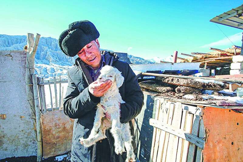 1月7日,乌什县亚曼苏柯尔克孜族乡别迭里山口牧业点,肉孜·萨迪克在查看小羊生长情况。