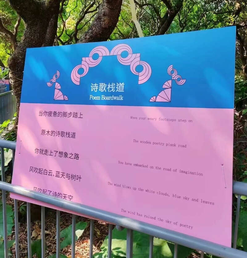 “诗歌公园”与“诗歌栈道”在颁奖典礼上同时亮相,孩子与诗人们的诗悬挂在公园的树上、栈道与天桥上,吸引了众多市民驻足观看。