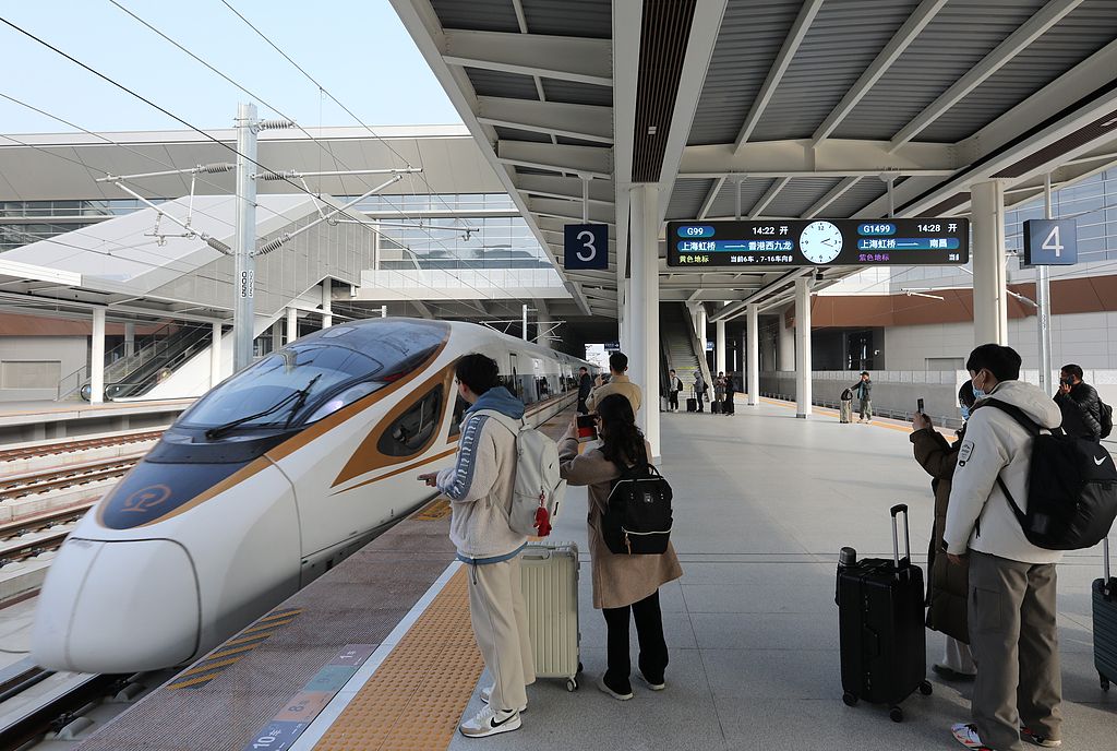 2025年1月5日下午,苏州南站,乘客在乘坐上海虹桥-香港西九龙G99列车。
