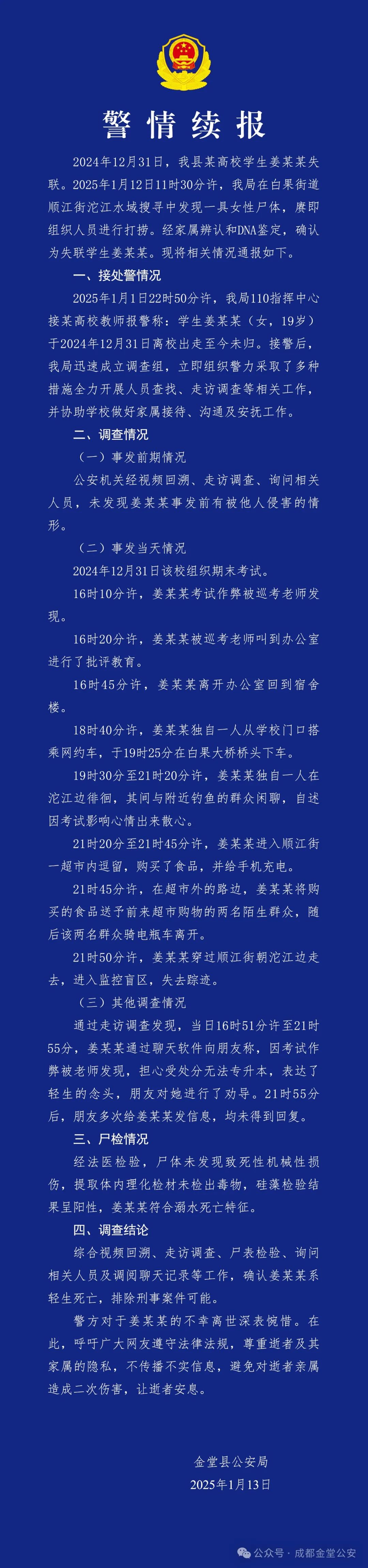 今天(1月13日)四川成都金堂县公安局发布通报:2025年1月12日11时30分许,金堂县公安局在白果街道顺江街沱江水域搜寻中发现一具女性尸体,打捞后,经家属辨认和DNA鉴定,确认为失联学生姜某某。