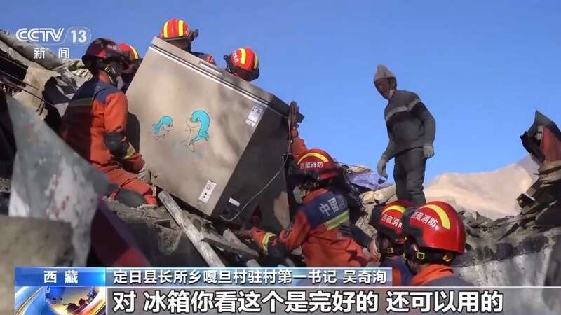 定日县长所乡嘎旦村驻村第一书记 吴奇洵:今天开始的,确定好了哪些户的具体位置,就开始干了。冰箱是完好的,还可以用的,所以他们把能救出来的都救出来。