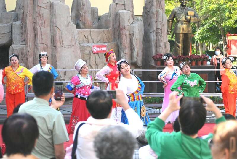 2024年9月25日,居民在宁夏银川市金凤区长城花园社区广场表演舞蹈。新华社记者 毛竹 摄