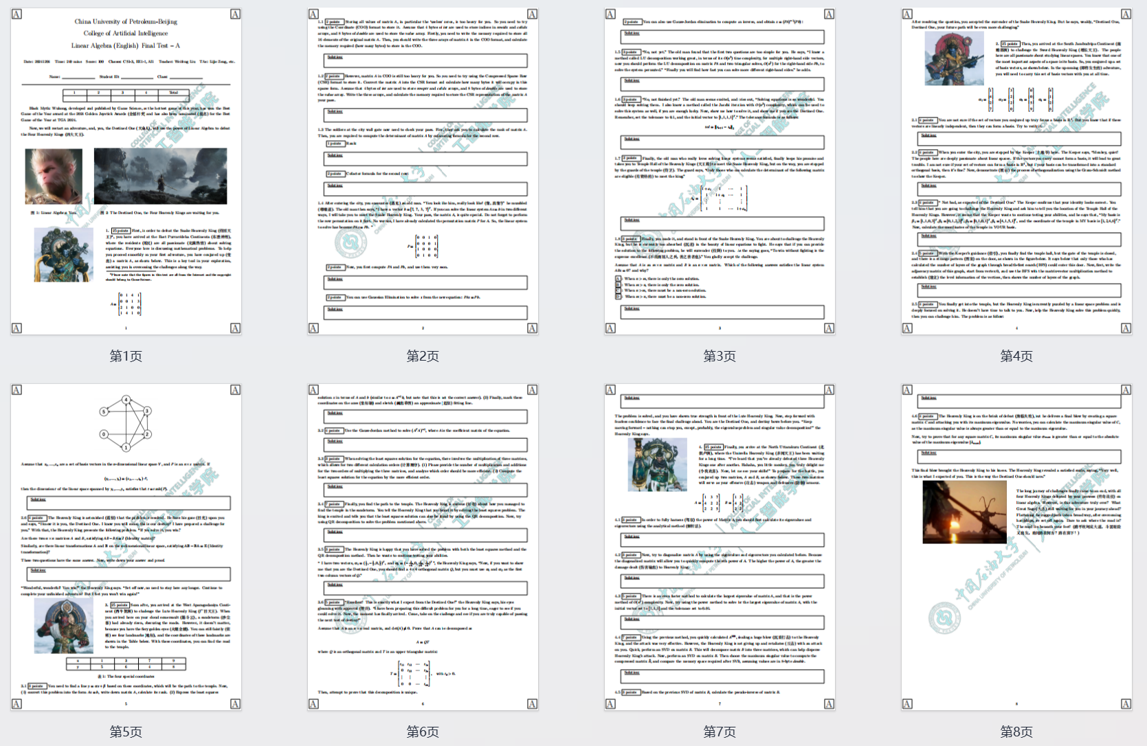 这份别出心裁的试题,出自中石大人工智能学院刘伟峰教授之手,是他为“线性代数”期末考试精心策划的创意之作。在这场期末考试中,“线性代数”不再是枯燥无味的学科符号,而是一场充满挑战与乐趣的奇幻游戏。刘伟峰巧妙融合热门IP——中国首款3A游戏《黑神话:悟空》的元素,设计了一系列寓教于乐、引人入胜的闯关挑战。每位考生都化身为“天命人”,在直接法与迭代法求解线性系统、线性空间、最小二乘与QR分解求解超定系统,以及特征值与奇异值分解等四大核心知识点上,分别向持国、增长、广目、多闻四大天王发起挑战,完成自己的天命之旅。在这场游戏中,学生们不仅深化了对“线性代数”概念的理解,更在解决问题的过程中,体验到了成就与乐趣的双重满足。