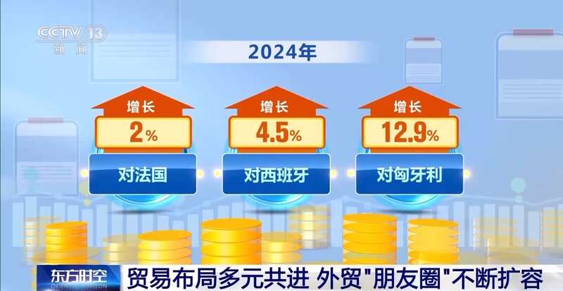 2024年,我国对欧盟、美国等传统市场保持增势。中欧双边贸易增长1.6%,其中对法国、西班牙、匈牙利分别增长2%、4.5%、12.9%。中美贸易增长4.9%,与我国外贸整体增速基本持平。
