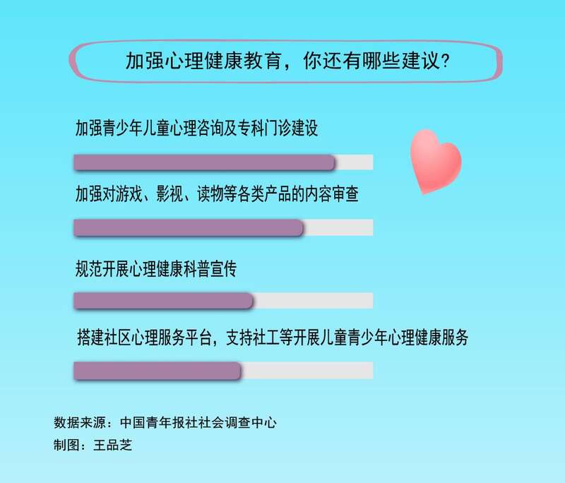 加强心理健康教育,71.2%的受访家长建议加强青少年儿童心理咨询及专科门诊建设,65.4%的受访家长建议加强对游戏、影视、读物等各类产品的内容审查,53.5%的受访家长建议规范开展心理健康科普宣传,50.1%的受访家长建议搭建社区心理服务平台,支持社工等开展儿童青少年心理健康服务。