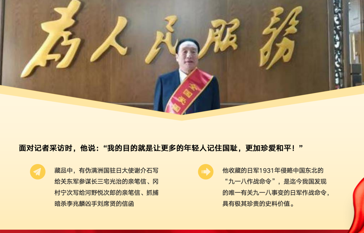 今天我要讲的宋金和先生正是最好的范例。他曾是黑龙江省佳木斯市公安局局长,退休后近20年坚持收集日军侵华物证,自掏腰包成立了博物馆,向世人展示日军侵华罪证和东北抗联的光辉事迹。他曾被评为全国爱国拥军模范,2021年11月,还被授予了第八届"全国道德模范"。