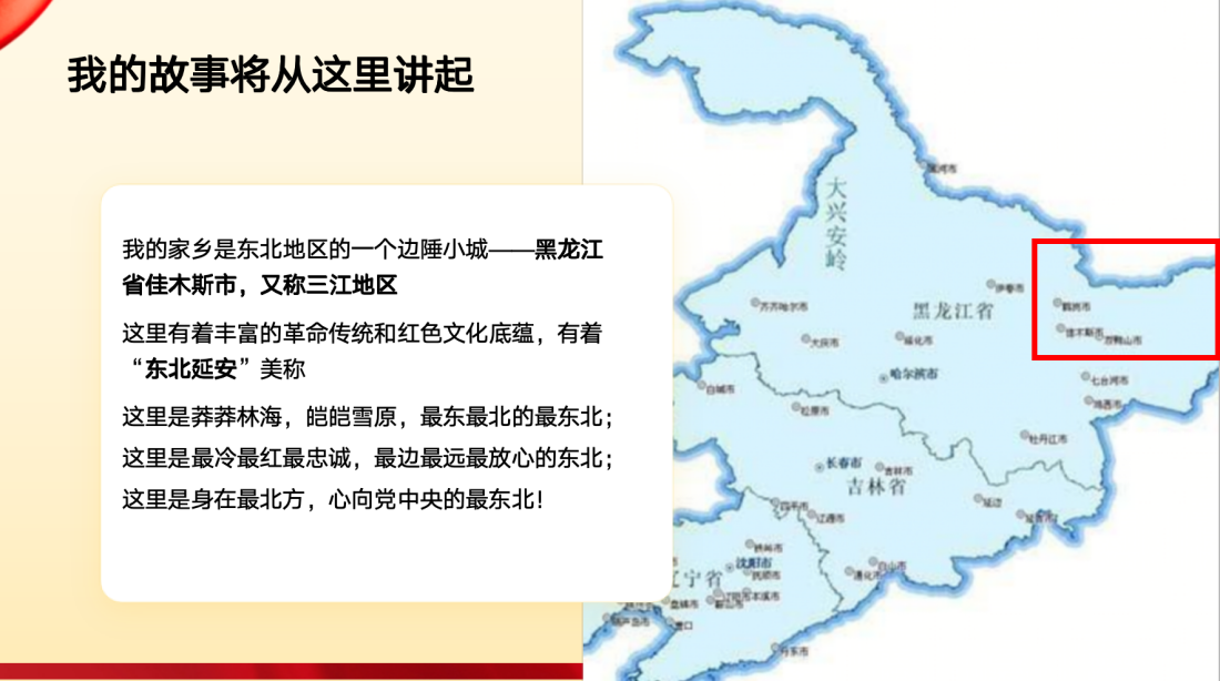 习近平总书记说,要把抗联的历史发掘好、研究好、宣传好,要用东北抗联精神教育我们的领导、党员和干部,用东北抗联精神发扬优良传统,赓续新风正气。这也是我今天宣讲题目的来源。东北抗联精神是中国共产党人精神谱系的重要组成部分,也在新时代迎来了更好的传承与发展。今天我将为大家解读东北抗联精神,并以全国道德模范宋金和为例,与大家分享我的个人感悟。