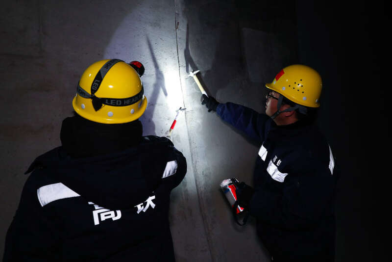 1月14日凌晨,在新乌鞘岭隧道内,桥隧工使用小锤检查边墙和施工缝。新华社记者 郎兵兵 摄