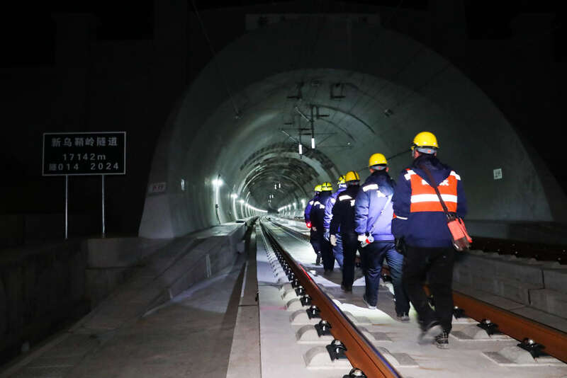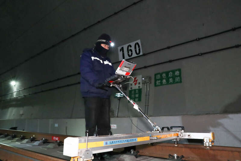 1月14日凌晨,在新乌鞘岭隧道内,线路工使用铁路轨道检查仪检查线路几何尺寸。新华社记者 郎兵兵 摄