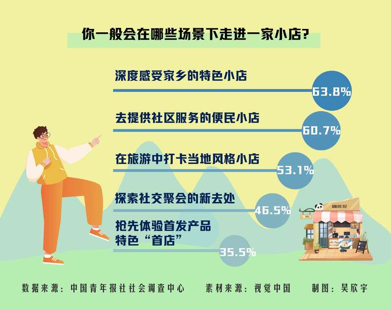 不同类型、适应不同场景的小店,让年轻人获得了更加多样的生活体验。调查中,受访青年最喜欢深度感受家乡的特色小店,获选率为63.8%,60.7%的受访青年喜欢去提供社区服务的便民小店,53.1%的受访青年会在旅游中打卡当地风格小店,46.5%的受访青年会探索社交聚会的新去处,35.5%的受访青年会抢先体验首发产品、特色“首店”(注:指一个品牌在某一区域开的第一家店)。