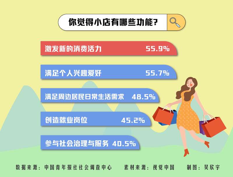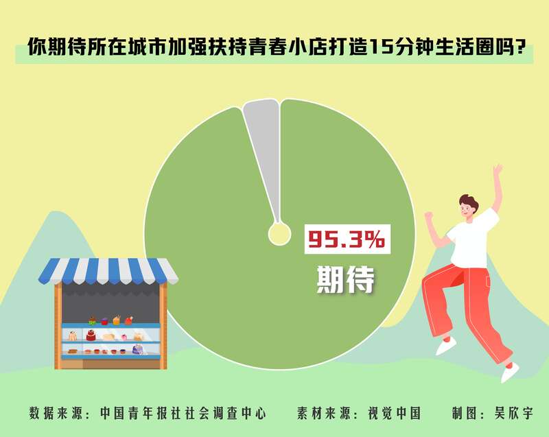 作为社会经济的“毛细血管”,越来越多的充满创新意识的青春小店,很可能发展成为城乡社区的新兴社交“节点”。调查中,95.3%的受访青年期待所在地加强扶持青春小店,打造15分钟生活圈。