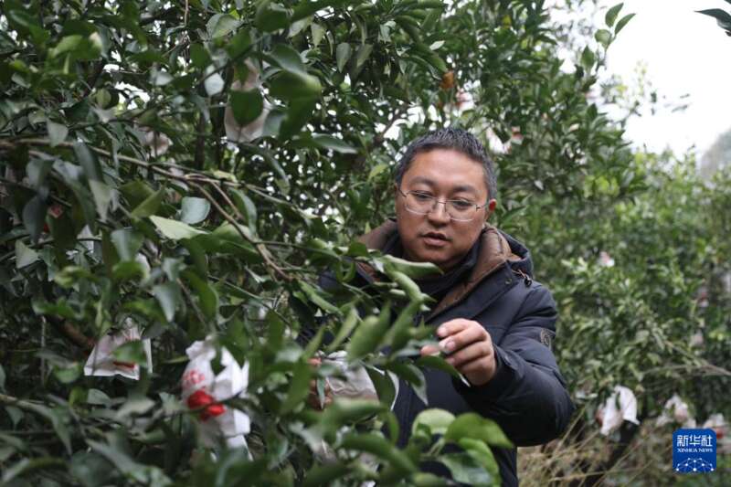 2024年12月19日,蒲江县铁牛村村民何孝成在柑橘林内查看柑橘长势。新华社记者 杨进 摄