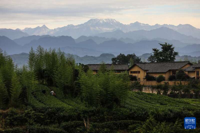 从蒲江县向远处眺望,可以看到起伏的丘陵和壮阔的雪山(2024年8月5日摄)。新华社发(蒲江县融媒体中心供图)