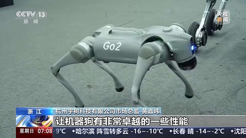 杭州宇树科技有限公司市场总监 黄嘉玮:我们最开始通过AI的强化训练,让机器狗有非常卓越的一些性能,比如现阶段是四足站立,可以变换成双足倒立。像这种动作,其实以前早的代码研究可能需要非常长的时间,通过现在AI的强化训练,让机器狗越来越强。