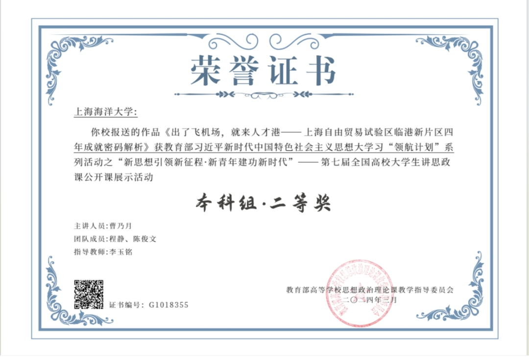 2025年1月7日,由教育部高校思想政治理论课教学指导委员会主办、南开大学马克思主义学院承办的“七十五载薪火传承,千秋伟业奋斗有我——第八届全国高校大学生讲思政课公开课展示活动”评审结果公示,由马克思主义学院李玉铭、董祥勇老师指导,陈俊文、张伊廷、程静、章诗涵、庞焱匀等同学共同创作的思政公开课《洋山深水港:科技巨轮下的中国航标》,在1339所高校提交的5007部参赛作品中获特等奖。