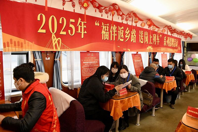 2025年1月20日,福州火车站,外来务工人员开心返乡过年。随着春节的日益临近,福州火车站陆续迎来返乡客流高峰。