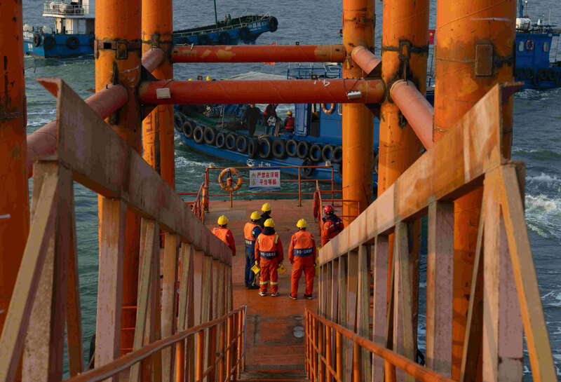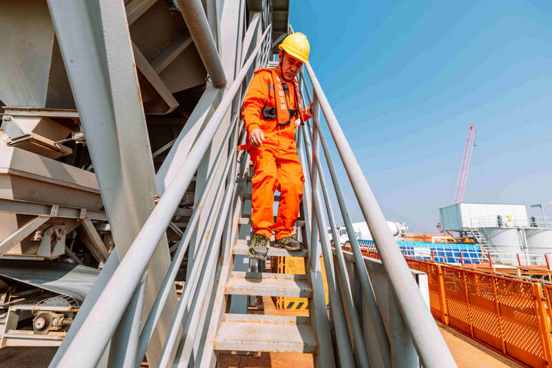 1月17日,夕阳下的厦门刘五店港区,北风劲吹。在距离中交一公局集团厦金大桥(厦门段)项目海上平台混凝土操作员梁芝敬站立位置不到30米的洋面上,一艘船身印有“帆顺168”字样的补料船,装载着4000多吨砂石缓缓抵近。船头前方延伸出一条25米长的传送皮带,将船上的砂料源源不断地送抵老梁眼前的钢制固料斗内。当天他们要趁着海水退潮带来的作业窗口,为站里补上700吨机制砂和900吨粒径10到20毫米的小石子,以确保混凝土站生产不停机。
