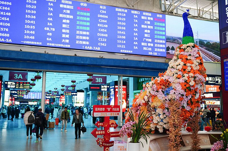 2025年1月21日,候车室里的“花朵孔雀”。春运期间,一只由数千枝花朵编织而成的“孔雀”亮相云南昆明火车站,成为春运路上一道亮丽的风景。