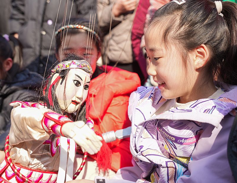 2025年1月21日,浙江省湖州市长兴县雉城街道高阳桥社区,孩子们和提线木偶互动。