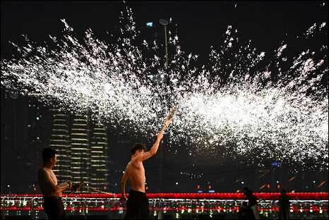 On the evening of January 18, 2025, Chongqing Kaifu Ruins Park staged an iron flower show, scattering iron flowers into the night sky like twinkling stars, combining with the night scenery of Chongqing, the people feel the joy of the New Year among the colorful lights.(Photo by VCG)