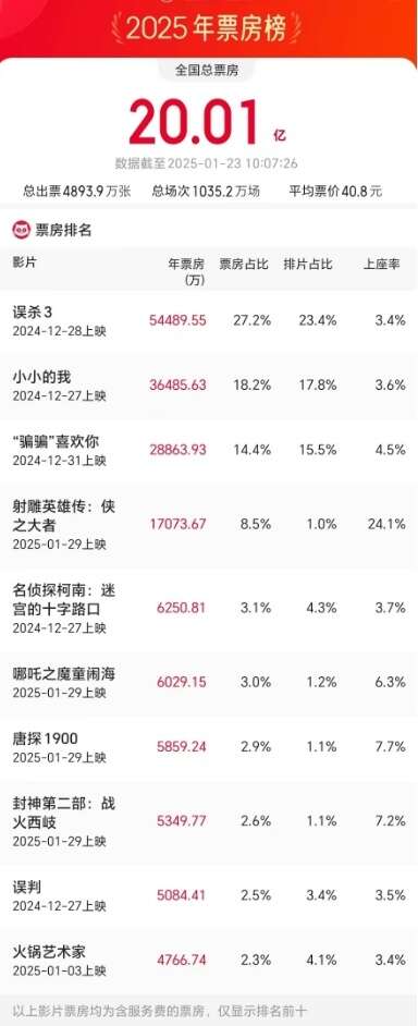 据网络平台数据,截至2025年1月23日9时42分,2025年度电影票房(含预售实时)破20亿。