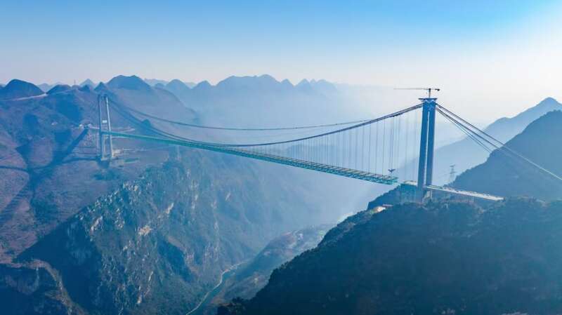 花江峡谷大桥则跨越这道“地球裂缝”,全长2890米、主跨1420米,桥面距水面垂直高度625米。它的桥高为世界第一、主跨为山区峡谷桥梁世界第一,被当地人称为“横竖都是世界第一”。
