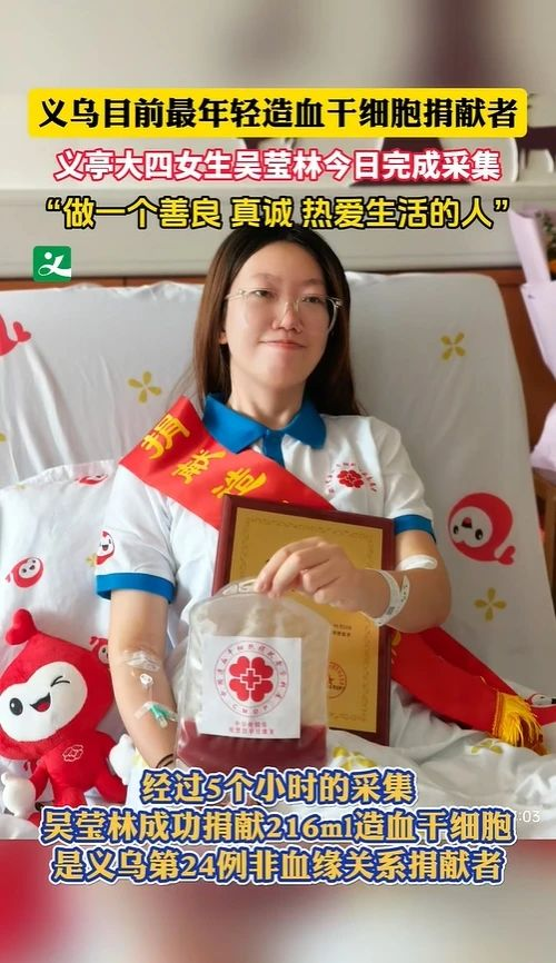 1月21日,随着针管拔出,中国计量大学现代科技学院00后大四学生吴莹林顺利完成216毫升造血干细胞混悬液的捐献,成为义乌市今年首例造血干细胞捐献者,为远方陌生患者送去生命新希望。