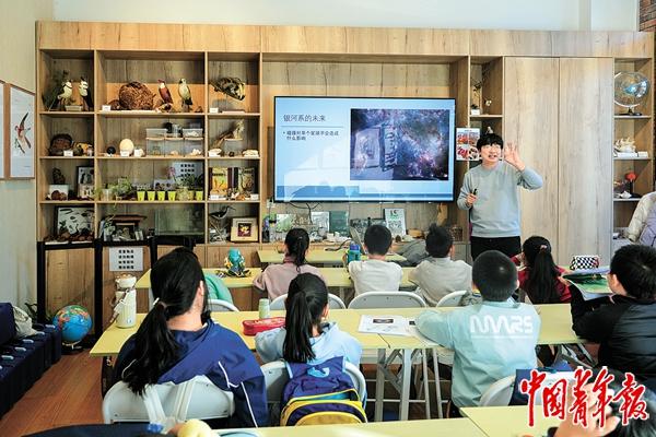比起行星、天体,一名男孩对“蝈蝈老师”手上的螳螂更感兴趣。男孩的家长告诉中青报·中青网记者,他们在这给孩子报了篮球课,刚好公园离家很近,路过博物营课堂外,男孩对“蝈蝈老师”上课展示用的小动物来了兴致。他在家里养了长戟大兜虫、角蛙、蜥蜴等,很想参加自然教育中心的课程。教室边还有一面自然标本墙,可以看到各类蝴蝶、果实——都是自然教育教师在外科考时搜集的。
