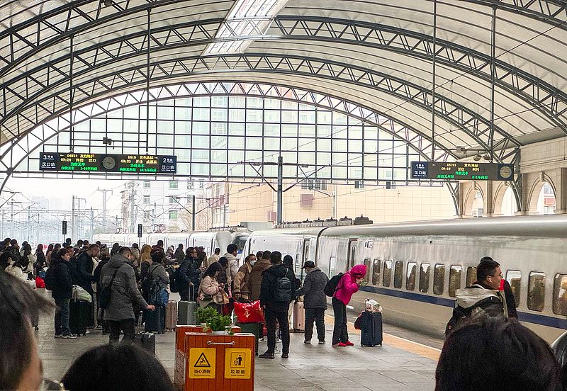 2025年1月24日,湖北省武汉市,汉口火车站迎来春运高峰,站台上排队检票进站的旅客。