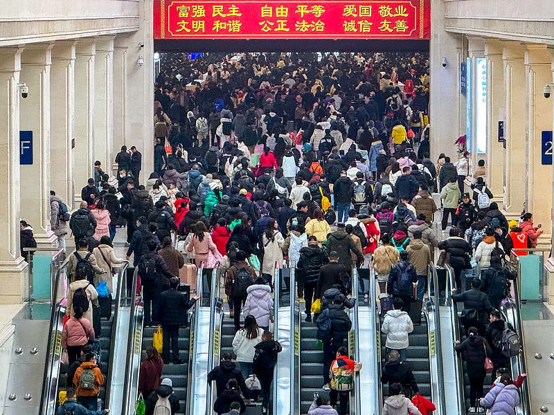 2025年1月24日,湖北省武汉市,汉口火车站迎来春运高峰,汉口火车站大扶梯上满满的人。