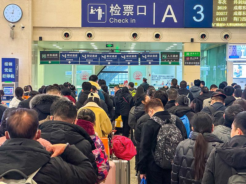 2025年1月24日,湖北省武汉市,汉口火车站迎来春运高峰,检票口排队检票的旅客。