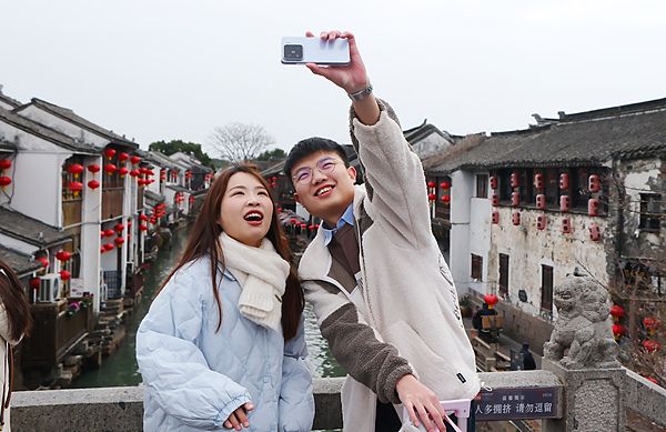 2025年1月25日,江苏苏州,一对情侣在充满节庆氛围的苏州市七里山塘景区水巷自拍合影照。