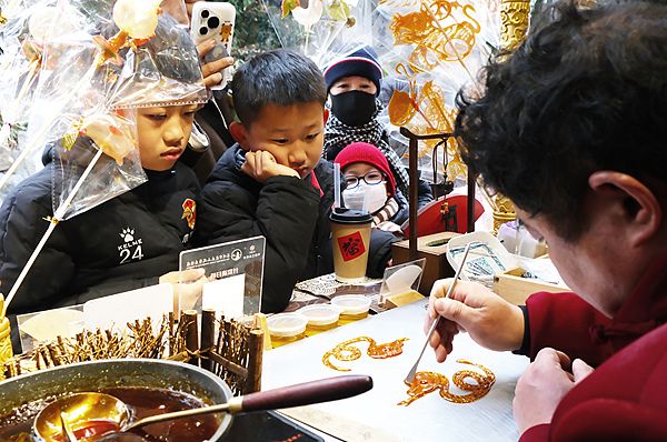 2025年1月25日,江苏苏州,几名寒假小朋友在虎丘景区观赏一位糖画艺人制作表演。