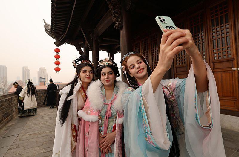 安徽芜湖:外国友人逛古城 身穿汉服体验中华传统文化