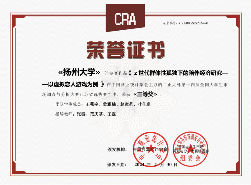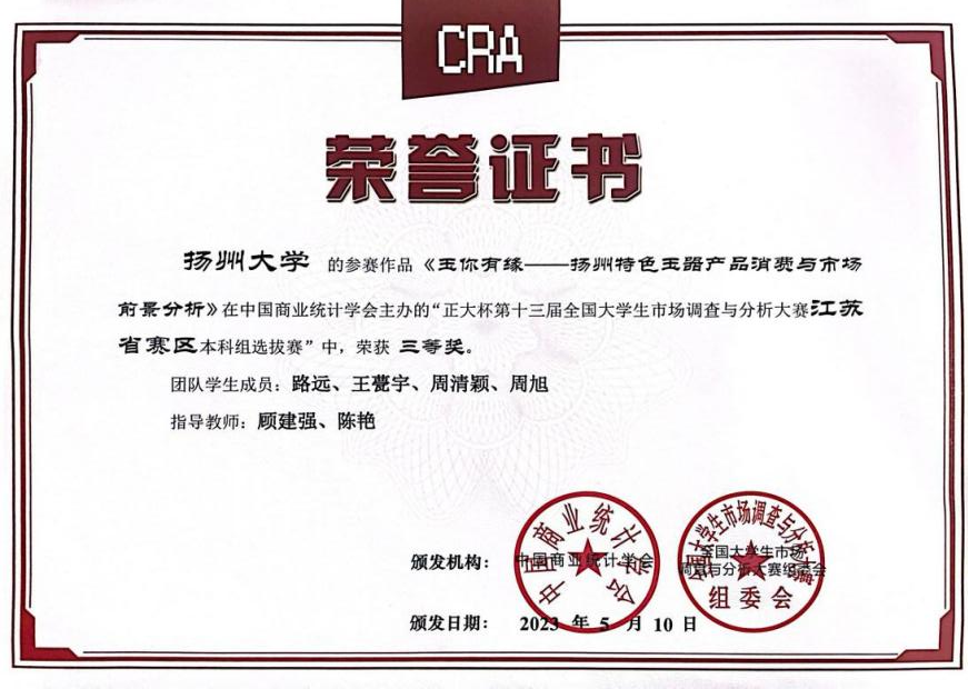 在科研竞赛方面,王甍宇始终保持着浓厚的兴趣和强烈的求知欲。她深知科研是学术研究的重要组成部分,也是提升自身学术能力的关键途径。三年来,她积极参与各类科研项目和竞赛,从最初的项目成员成长为如今的核心负责人,在全国大学生市场调查与分析大赛(江苏赛区)中赢得佳绩。回顾来时路,每一步,她都亲力亲为,每一步,都见证着她的汗水与进步。