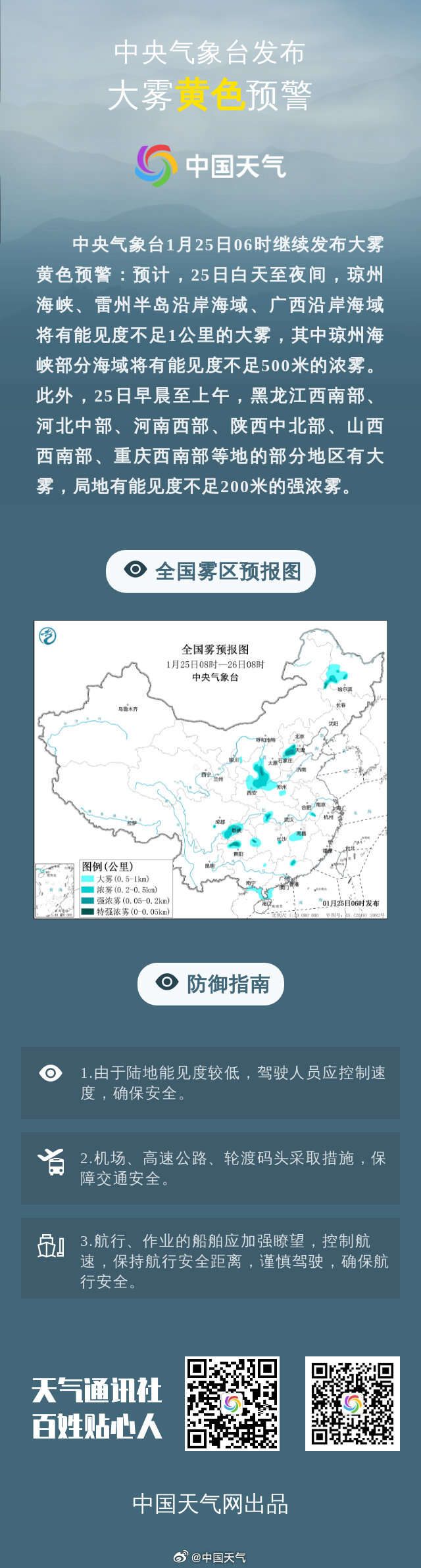 大雾→25日早晨至上午,黑龙江西南部、河北中部、河南西部、陕西中北部、山西西南部、重庆西南部等地的部分地区有大雾。