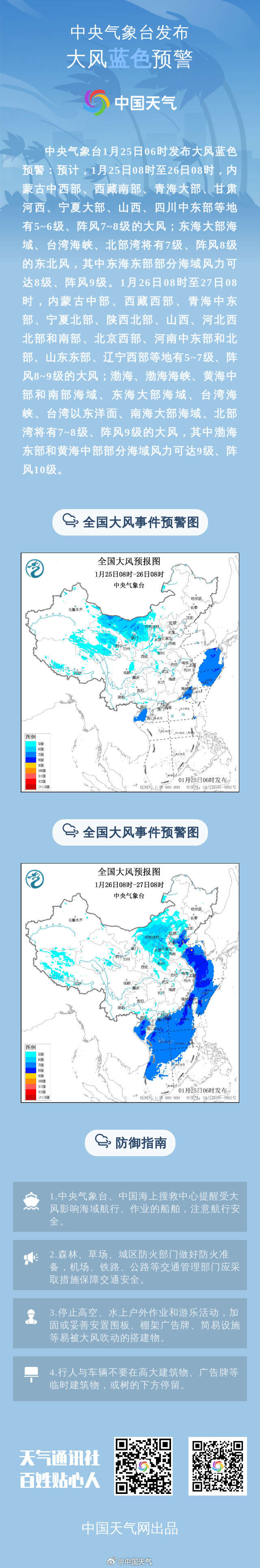25日早晨,中央气象台发布了寒潮黄色预警、暴雪蓝色预警、大风蓝色预警、大雾黄色预警。