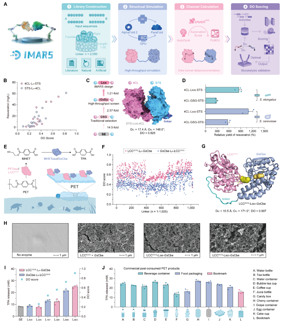 为了应对上述挑战,研究团队通过高通量测试及空间结构预测解析了人工多酶复合体的空间构效关系,初步破译了多酶空间邻近性和效率的“密码”,发现融合酶的空间距离和通道角度是影响催化效率的关键因素。基于此,研究团队开发了人工多酶复合体理性设计工具iMARS,内置包含上千种不同性质linker的数据库,通过ParaFold进行高通量蛋白质结构预测,并基于分子对接和CAVER等工具进行计算和DO Score打分筛选,实现从氨基酸序列到人工多酶复合体相对活性的快速预测。
