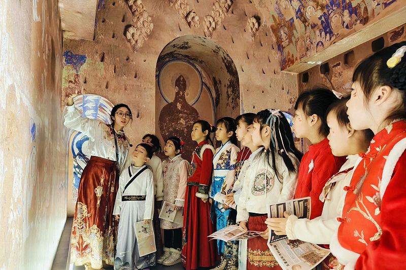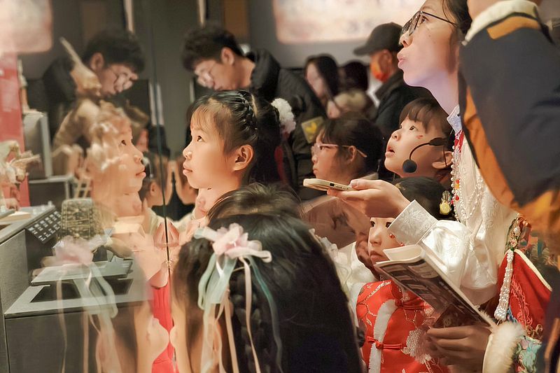 2025年1月26日,乌鲁木齐,孩子和家长在新疆维吾尔自治区博物馆展示文化作品。