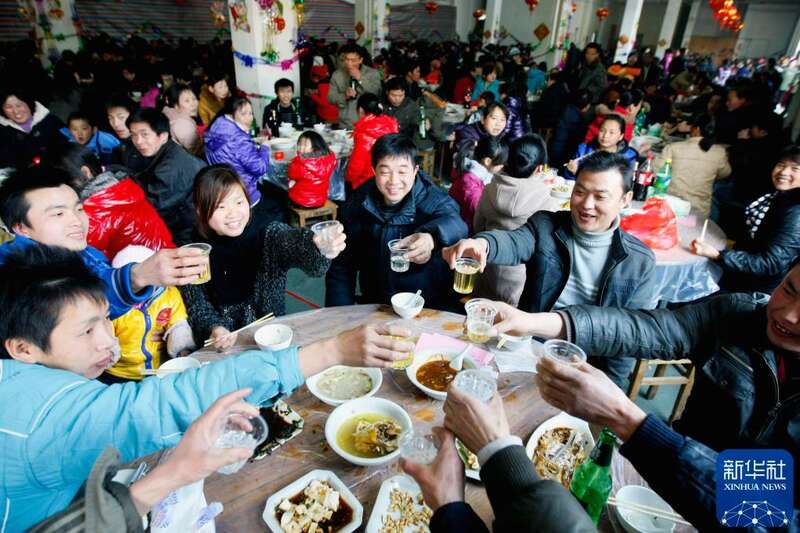 2011年2月2日,浙江诸暨一家公司准备了丰盛的年夜饭,招待800多名没有回家过年的员工及其家属,欢聚一堂共迎新年。新华社发(郭斌 摄)