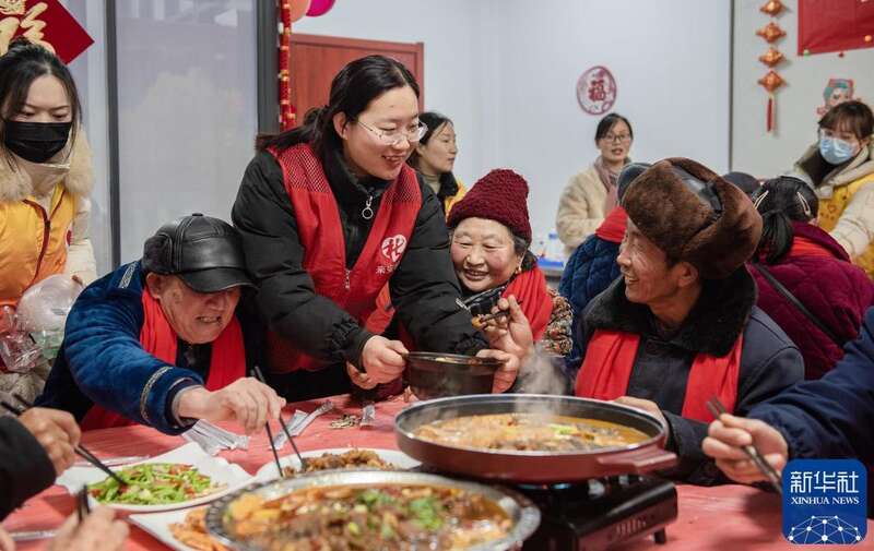 2024年2月9日,安徽省滁州市来安县新安镇社工组织空巢老人一起吃爱心年夜饭。新华社发(吕华 摄)