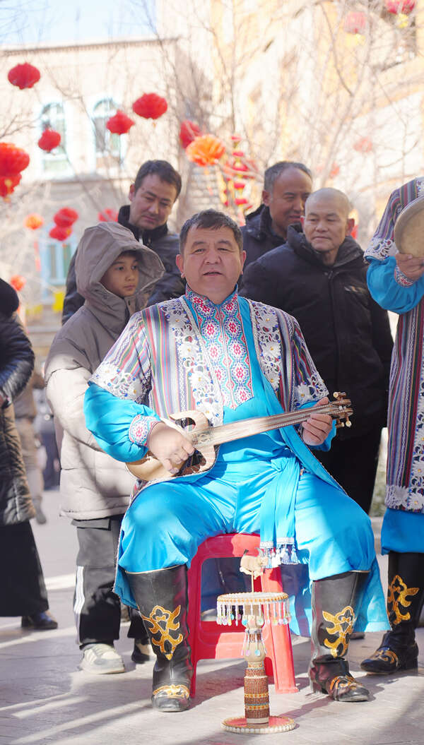 身穿靓丽演出服的民间艺人弹着热瓦普唱着歌