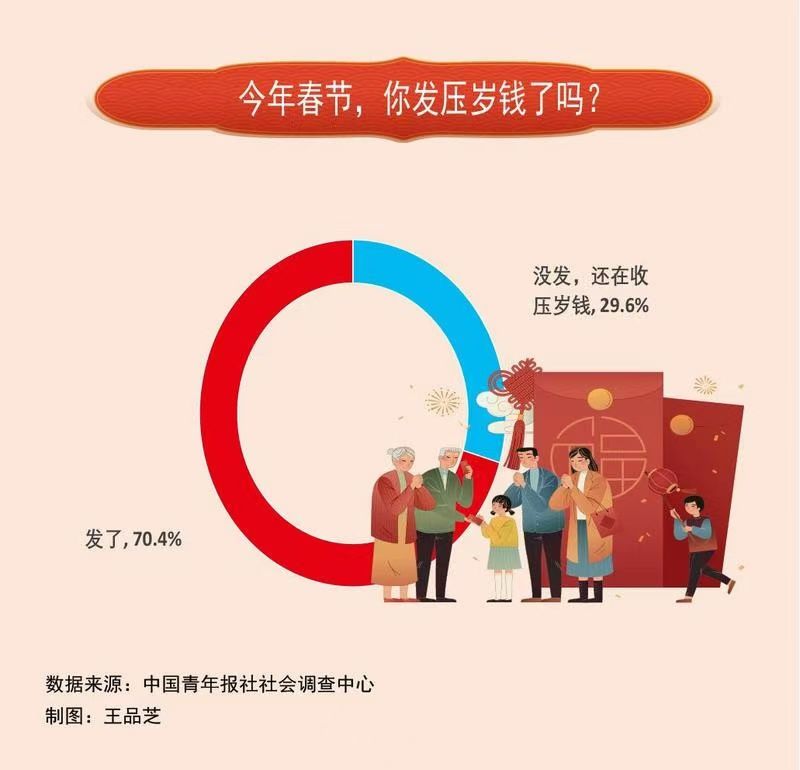 今年春节,70.4%的受访者发了压岁钱,29.6%的受访者没发,还在收压岁钱。
