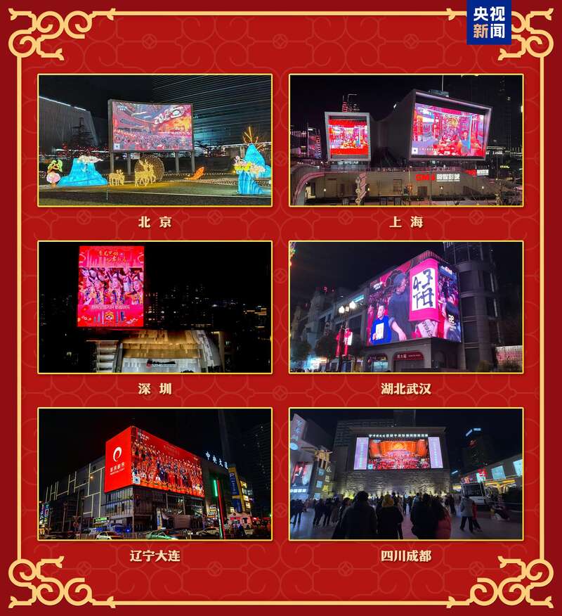 全国“百城千屏”看春晚。在北京、上海、深圳、重庆、武汉、无锡、大连、成都、西宁等全国100多个城市的超1500块地标大屏,配合云听客户端的三维菁彩声同步直播春晚,点亮了除夕夜的城市夜空。绚彩清晰、沉浸细腻的视听效果吸引了居民和旅客们驻足,也为他们送上一份贴心温暖的喜庆祝福。