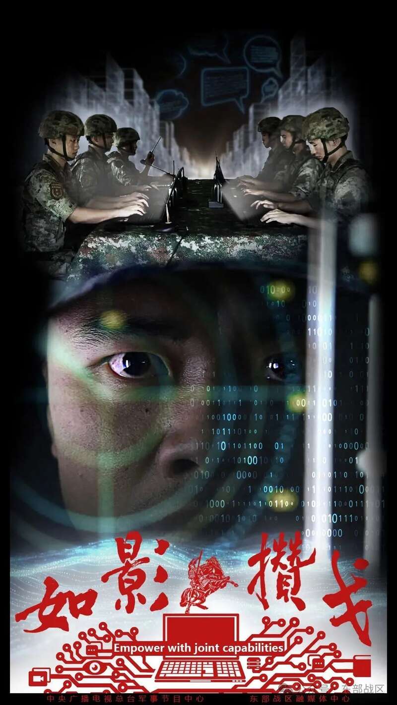 此次海报延续了解放军东部战区一贯的“繁体字+英文”表达,指向意味和胸怀格局不言自明。其中,海报《如影攒戈》的中英文翻译暗藏玄机。单从画面来看,图中映射的数据流、剪纸中的电脑和电路图,让人不禁猜测这是否代表解放军新成立的信息支援部队,但“joint capabilities”译为“联合能力”,“攒”也就更多带有“攥指成拳”的意味。张军社表示,“如影攒戈,决不单指网络空间力量的积攒,而是强调用无形的手将有形的力量汇聚起来,这个‘无形’就是解放军网信聚能和数智赋能的科技实力,正是‘海陆空火仗吴钩,如影随形汇铁流’。”