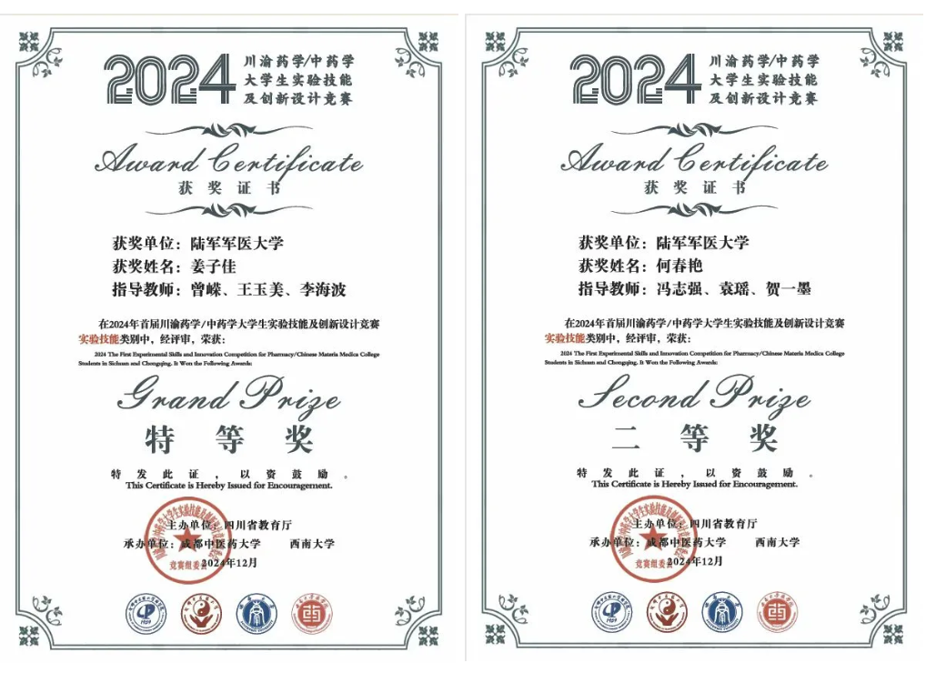 历经3个月集训、三轮考核选拔,何春艳、姜子佳2 位 学员以扎实 的 基础和稳定的操作脱颖而出,站上 最高竞技舞台, 接受专业知识、实验技能和临床应变等 综合能 力考验,先后获得“川渝赛道”特等奖、二等奖,“全国展示”一等奖、二等奖的优异成绩。
