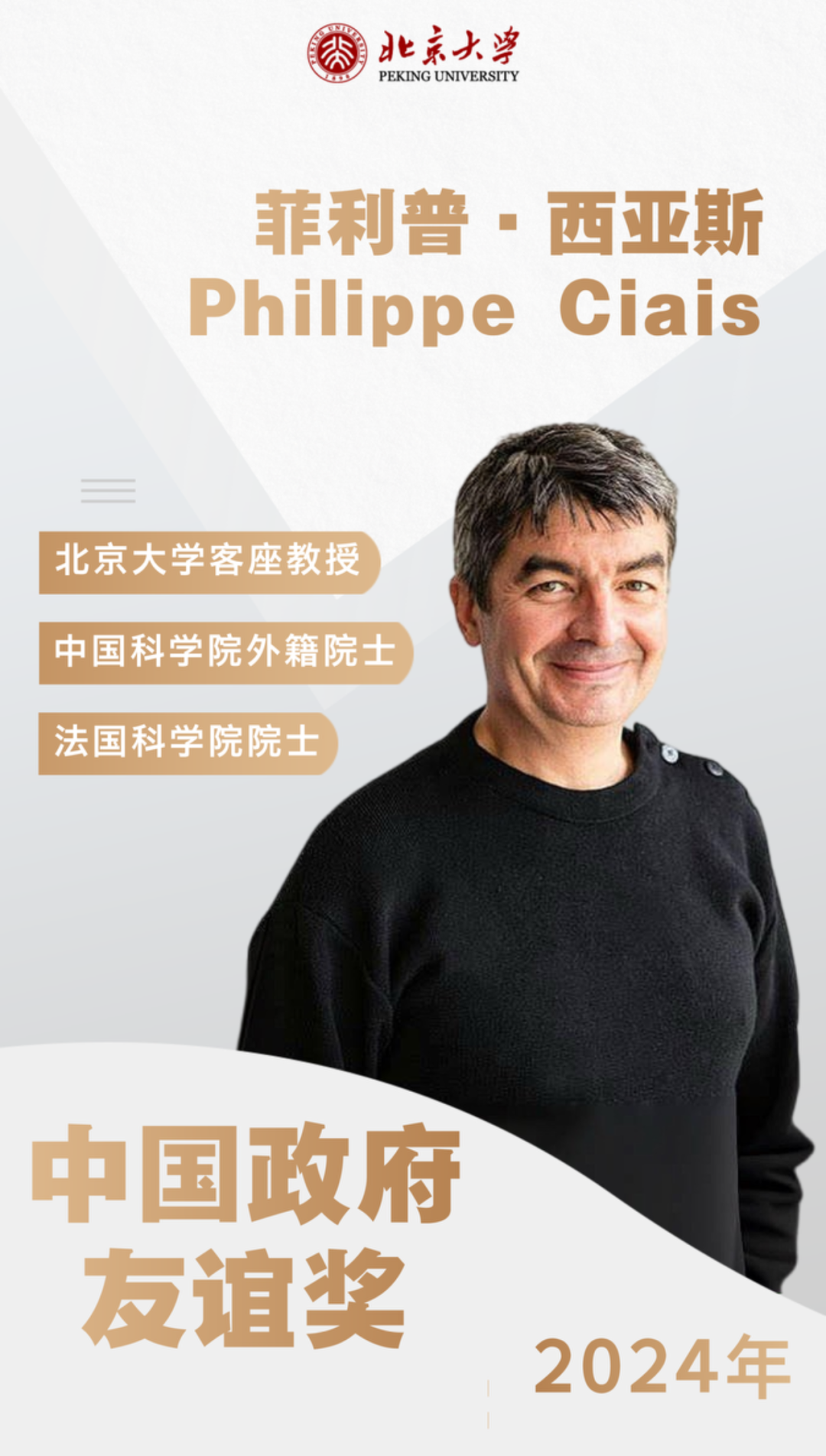 菲利普·西亚斯(Philippe Ciais)主要研究领域为地球系统科学,是全球气候变化领域的专家,现任法国原子能署气候与环境实验室资深研究员、法国科学院院士、中国科学院外籍院士、北京大学客座教授,曾任全球碳计划主席、IPCC第五次评估报告碳循环章节的主要作者召集人。2016年曾获欧洲地球物理联盟哥白尼奖章,2018年曾获法国科学院多洛米厄奖,并与IPCC评估报告的其他主要作者一起被授予2007年诺贝尔和平奖。他发表SCI论文900余篇,其中100余篇发表在Science、Nature及其子刊,论文总被引7.6万余次。西亚斯院士在发展大气CO2和CH4反演模型、研发陆面过程模式等方面取得了系统性和创新性成果,是欧洲碳综合观测系统的创始人。
