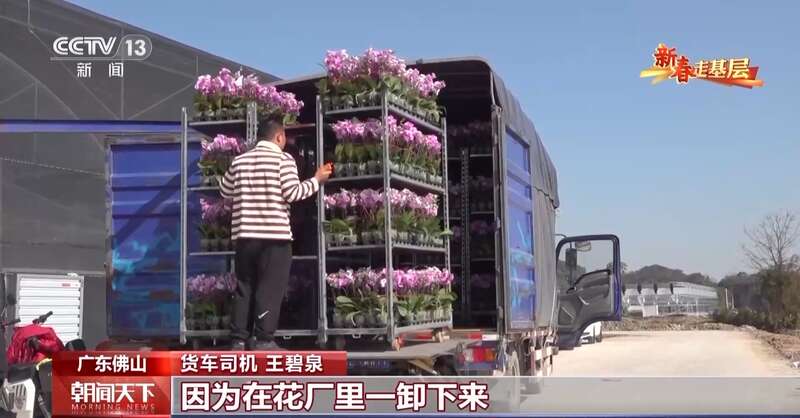 广东佛山货车司机 王碧泉:我这样拉一车,等于是网约车拉三四车左右。这一车我拉三千多盆,这样就比较省人工、省时间。我有几套架子,卸掉花再装是比较快的。