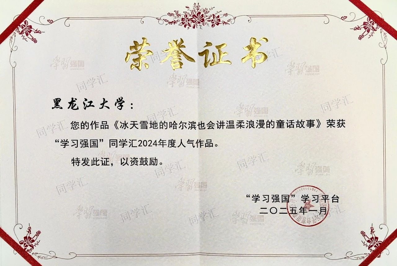近日,“学习强国”学习平台公布了“学习强国”同学汇2024年度人气作品(高校)Top100、2024年度人气作品(个人)Top100、2024年度高校融媒团队Top50名单。 黑龙江大学被评为2024年度“学习强国”同学汇最具传播力高校,黑龙江大学全媒体中心被评为2024年度高校融媒团队Top50,《冰天雪地的哈尔滨也会讲温柔浪漫的童话故事》荣获“学习强国”同学汇2024年度人气作品。